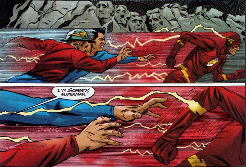 Das Rennen führt in die ferne Zukunft. Es ist ein Kopf-an-Kopf-Rennen, Superman scheint etwas schneller zu sein. Da opert sich Jay als wahrer Held. Da er ohnehin nicht mehr der Jüngste ist (aber sich immer noch jung hält dank der Speed Force), absorbiert er Supermans „kinetische Energie“, gibt sich einen Schub, berührt Wally und sieht dann plötzlich sehr alt aus.