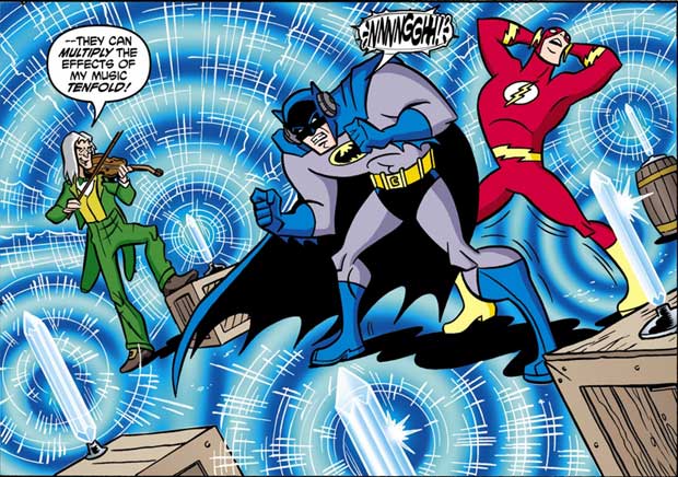Während Flash (Wally West) Hinweisen zu Fuß nachgeht und in Windeseile die Stadt abklappert, bleibt Batman am Tatort, benutzt seine Hilfsmittel und sein Gehirn. Kaum ist Flash mit einer Erkenntnis zurück, weiß Batman längst Bescheid. Der Schurke kann nur der Fiddler sein, ein Mann mit einer manipulativen Geige, ähnlich wie der Pied Piper. Er lässt Glas zerspringen und Menschen vibrieren. Als die Helden ihn beide stellen wollen, lässt des Fiddlers Vibrato das heruntergekommene Versteck einstürzen. Flash kann alle schnell retten – und nebenbei den gestohlenen Kristall zurückholen. Damit hat Flash den Wettkampf der Detektive gewonnen.