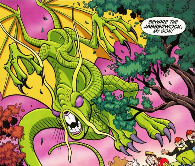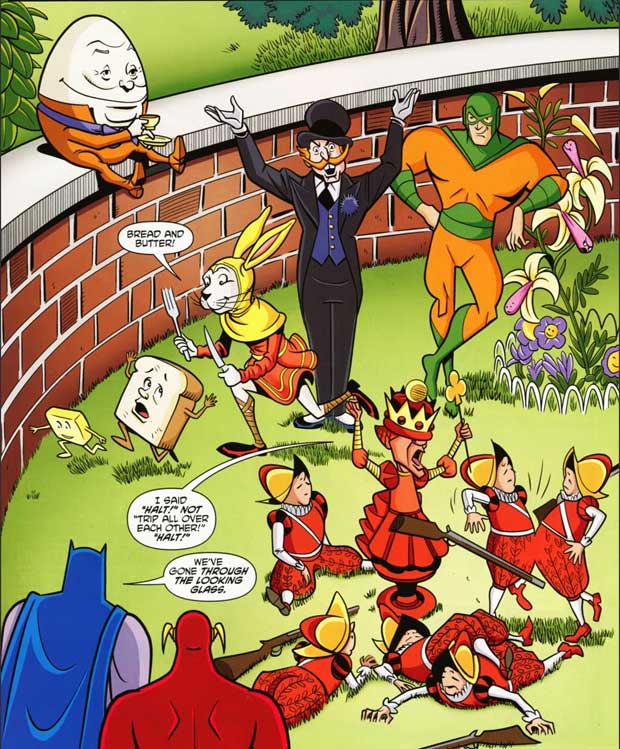 Und so versuchen sie, ihren Kopf nicht zu verlieren, Flash setzt den zerbrochenen Humpty Dumpty wieder zusammen, Batman bezwingt den Jabberwock nicht mit dem Schwert sondern mit Mad Hatters Gedankenkontrollhut.