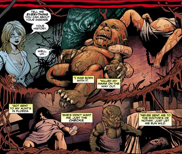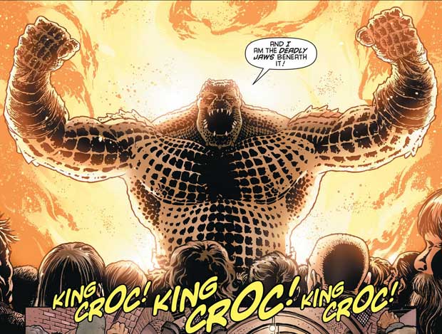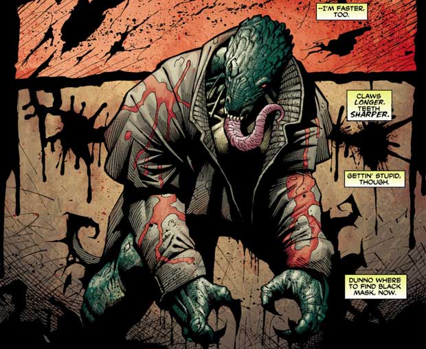 Bei Killer Croc war Anfang der Nuller-Jahre so viel passiert, dass man in „The Beast Beneath: Croc’s Tale of Tears“ (Detective Comics #808-810, 2005) alles noch einmal rekapituliert hat: Hush hat Croc mit einem Virus infiziert, das ihn weiter zu einem Reptil mutieren und seine Menschlichkeit und seinen Verstand fast ganz verlieren ließ. Dann wurde er geheilt (was man in Broken City sehen kann), dann aber mutierte das Virus weiter.