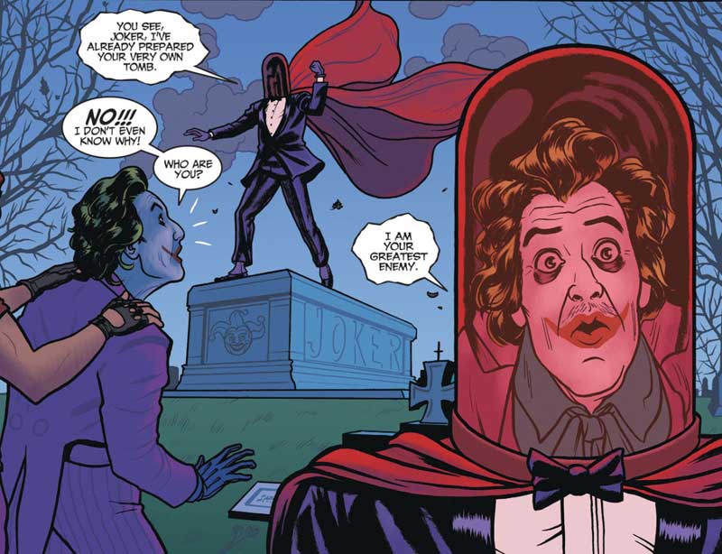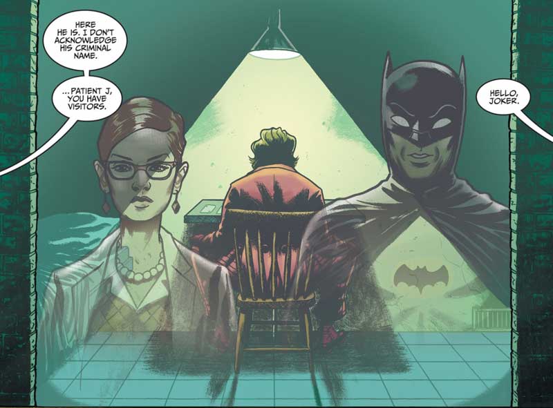 Besonders interessant ist die Joker-Story: Da taucht zum ersten Mal in diesem Universum ein gewisser Red Hood auf, der sich am Joker rächen will. Batman und Robin suchen das Arkham Institute auf (ebenfalls eine Premiere in dieser Welt), wo eine gewisse Dr. Quinn arbeitet, die zwar noch nicht Harley Quinn ist, aber schon gerne rote Karos trägt. Dann spielt die Szene auf The Killing Joke an, nur um am Ende zu offenbaren, wer unter der roten Haube steckt: der Arzt Overbeck, der mit seinem „brain regulator“ die Arkham-Patienten zu heilen versucht, aber am Joker gescheitert ist, da man dieses kranke Hirn einfach nicht reparieren kann. Der Clown machte Overbeck unfreiwillig zum Komplizen, um ihm zur Flucht zu verhelfen. Seltsamerweise hatte der Joker, verrückt wie er ist, den ganzen Plan wieder vergessen …