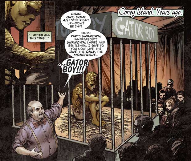 In „Monster“ (Gotham Nights #14, 2020) begeht unser Croc einen Bankraub und trifft dabei auf eine Jugendbekanntschaft: Julie, die er noch aus seiner Zeit als Sideshow-Attraktion kennt. Als er noch als „Gator Boy“ in einem Käfig zahlendem Publikum vorgeführt wurde, hat sie sich für ihn gegen Mobber eingesetzt. Nun, Jahre später, macht sie ihm Vorhaltungen: „You had a chance to treat the world better than it treated you. But instead you chose to do otherwise. Instead you became the monster they always said you were.“ Dem ist nicht mehr viel hinzuzufügen. Croc sagt nur, er wisse nun, wer er sei – und fügt sich in seine Rolle. Ziemlich schwach.