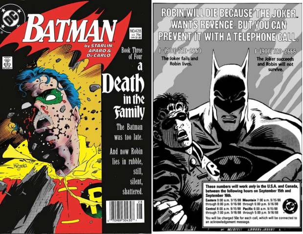 Im Jahr 1988 durften die Fans entscheiden, ob Robin II (Jason Todd) einen Angriff des Jokers überlebt oder nicht. Das Votum per Telefon fiel knapp aus, 5,343 gegen 5,271 Stimmen entschied sich für Tod, was dann auch in Batman #428 wahr wurde. Die Storyline A Death in the Family (dt. Ein Tod in der Familie) schrieb Comicgeschichte, auch weil Batman den ersten Tod eines Robins nur schwer verkraftete und er sich lange selbst die Schuld dafür gab.