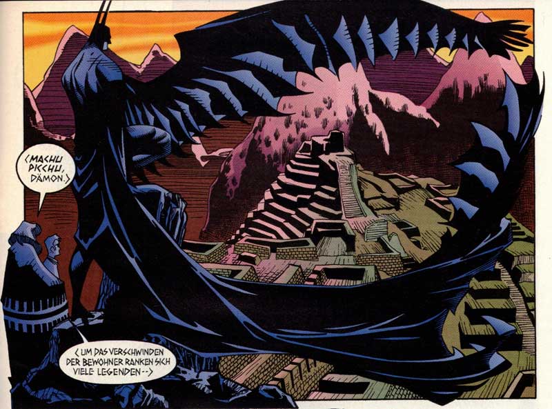 Und dann muss sich Batman auch von dem Inka-Priester unbequeme Fragen gefallen lassen, warum er sich wie eine Fledermaus kleidet und ob das wirklich den gewünschten Effekt hat, das Böse zu erschrecken oder gar zu besiegen.