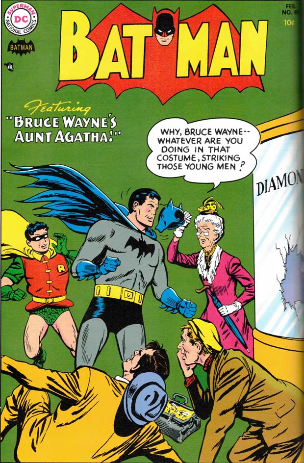 Einige von euch kennen sicher Dick Graysons Tante Harriet Cooper, besonders bekannt durch die TV-Serie mit Adam West. Doch auch Bruce Wayne hat eine Tante, wie die Leser bereits 1955 erfahren durften. Bruce und Dick kommen gerade von einem Einsatz als Batman und Robin heim, da klingelt es an der Tür und sie steht vor ihnen: eine hagere alte Frau mit Brille und weißen Haaren. Jahre nicht gesehen, nun will sie eine Woche oder zwei bleiben.