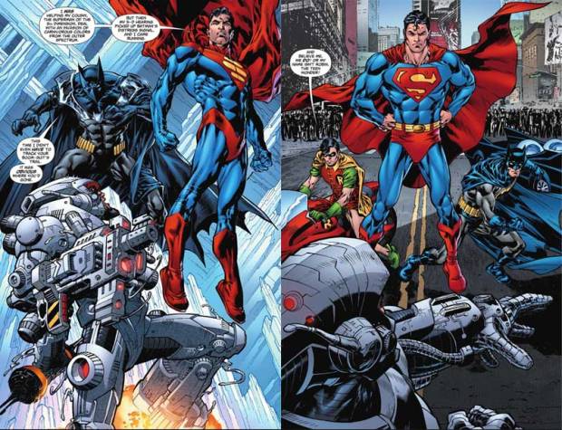 Mit diesem pfiffigen Gedankenspiel, beginnt das letzte Paperback der Serie Superman/Batman, das leider nicht den ganzen Rest der Serie umfasst. (Wer alles will, muss den Omnibus kaufen.) Die zweite Story („World’s Finest“) führt uns ins 853. Jahrhundert – die Zeit von DC One Million. Der Zeitschurke Epoch wird von Superman und Batman festgenommen, bricht aber vom Gefängnisplaneten Pluto aus, klaut eine Rüstung aus der Batcave und später auch sein Zubehör, mit dem er in unsere Zeit zurückreist, um dort die Weltherrschaft an sich zu reißen. Während die One-Million-Helden in einer Zeitschleife gefangen sind, müssen Batman, Superman und Robin (Teen Wonder) unserer Welt das Schlimmste verhindern.