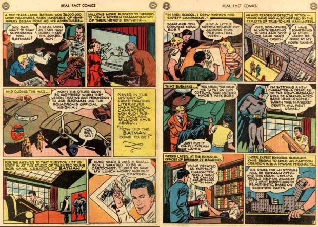 Die Story in Real Fact Comics dürfen nur die Wenigsten gelesen haben, aber sie zeugt von einer Skrupellosigkeit, mit der auch Jerry Siegel und Joe Shuster um ihre Rechte betrogen wurden. Besonders dreist ist, dass dieser Unsinn als wahre Geschichte neben anderen präsentiert wird und im Impressum lauter Gelehrte als Berater genannt werden. Hier wurde Kindern ein Märchen aufgetischt – und noch nicht einmal ein gutes. Denn wie Bob Kane auf die entscheidende Idee mit Batman kam, wird gar nicht erwähnt. Der Sprung von Detektivstorys zu einem Vigilanten im Fledermauskostüm ist groß. Gerade diese Lücke ist verräterisch: keine Erwähnung von Vorläufern wie The Shadow und Dracula oder dem Fluggerät von Leonardo Da Vinci.