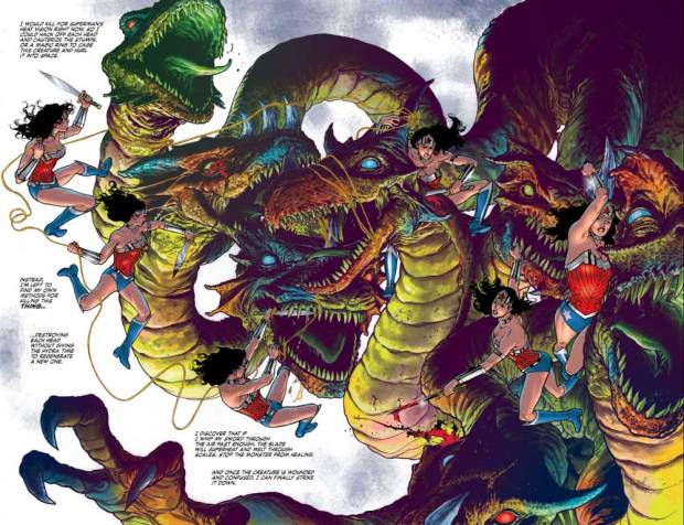 Die Storyline kommt hier zu ihrem ultimativen Höhepunkt: Williams und Blackman bescheren uns ein Fantasy-Spektakel voller Monster und epischer Schlachten, aber auch voller Phantasie, Überraschungen und Augenweiden. Der Zeichner übertrifft sich hier mal wieder selbst mit grandiosen Layouts über viele Doppelseiten, Gänge durch Labyrinthe erinnern an sein Meisterwerk Promethea (mit Alan Moore), zum Schluss kämpft Wonder Woman gegen eine Hydra, wie man sie noch nicht gesehen hat, denn sie mutiert aus Killer Croc! Es kommt selten vor, dass man auf fast jeder Seite eines Comics überwältigt wird – hier darf man sich dessen glücklich schätzen. Und man sollte dieses Werk auf Papier und in möglichst großem Format lesen, um die unzähligen Details in voller Pracht würdigen zu können.