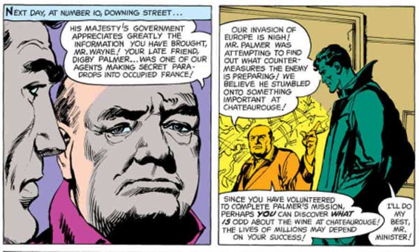 Zeit für eine Rückblende! Bruce Wayne dient im Zweiten Weltkrieg als Spion. Er ist gerade in London, als ein Kollege ihn auf ein Weingut aufmerksam macht und kurz darauf zufällig bei einem Bombenangriff ums Leben kommt. Bruce geht dann mal eben in die Downing Street 10, zu Premierminister Winston Churchill, und bekommt von ihm den Auftrag, das Weingut zu untersuchen.