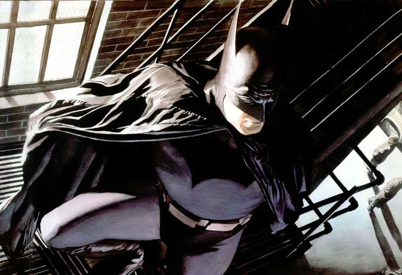Wenn man Alex Ross kritisch betrachtet, dann wird auch klar, warum wir nicht mehrere Batman-Darstellungen dieser Art sehen. Nicht, weil es an fähigen Malern fehlte: Es gab seitdem viele gemalte Versionen, aber nur wenige so fotorealistische. Batman ist zunächst eine Comicfigur, ein (offener) Cartoon. Er wurde zuerst mit Tusche gezeichnet und wurde auch dafür geschaffen, schwarze Konturen und nur wenige Farben zu haben. Er sieht am besten aus, wenn sein Cape schwarz ist, sich die Muskeln unter dem grauen Kostüm abzeichnen und die Augen bloß weiße Schlitze sind. Und überhaupt wirkt die Figur dann am stärksten, je weniger man von ihr sieht und wenn, dann möglichst übertrieben: ein Meter lange Ohren wie Teufelshörner, fünf Meter lange Capes mit Eigenleben, unmögliche theatralische Posen oder auch reduziert aufs Nötigste. All diese bewährten Stilmittel geben der Figur erst das Mythische, Entrückte, das wir an ihr schätzen.