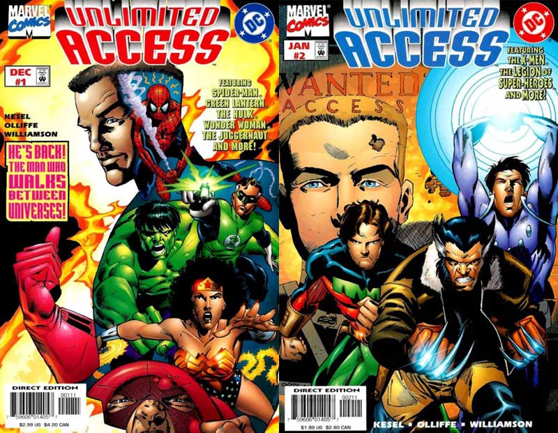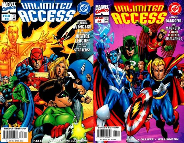 Nach DC versus Marvel und All Access geht das große Crossover in die dritte Runde. Wieder bildet die Figur des Weltenwächters Access (Axel Asher) den Rahmen, wieder geraten die Welten durcheinander. Zuerst taucht der böse Mantis von Apokolips im New York des Marvel-Universums auf und kämpft gegen Spider-Man, dann auch noch Wonder Woman gegen Juggernaut, dann Hulk gegen Green Lantern …
