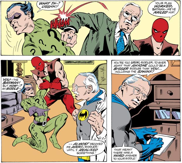 Dort trifft Batman auf einen neuen rotmaskierten Helden: Swashbuckler, Neffe des legendären Vigilanten „Vigilante“. Dumme Decknamen liegen anscheinend in der Familie. Trotz vereinter Kräfte lassen sie den Riddler entkommen. Und wieder. Und wieder. Beim letzten Mal wird Batman von einem Giftpfeil getroffen, der ihn zu seinem Glück und zu Riddlers Bedauern nicht umbringt. Warum der Schurke kein stärkeres Gift nimmt oder Batman daraufhin umbringt, sondern abhaut, bleibt das größte Rätsel.