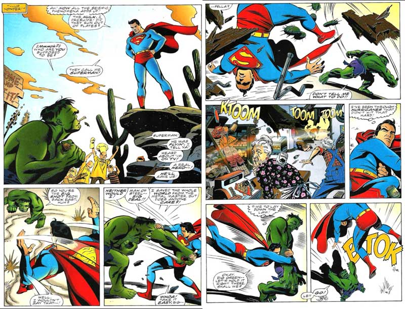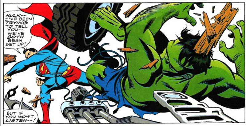 Es ist schon seltsam, dass es erst so spät zu dieser Konfrontation kam. Nach einem Kampf zwischen Superman und Spider-Man, dem ersten DC-Marvel-Crossover, ließ man ausgerechnet Batman gegen den Hulk antreten – ungleicher könnten Gegner nicht sein. (Aber es gelang sehr gut!) Erst 1996, im Event DC versus Marvel, kam es zu einer Schlägerei zwischen Superman und Hulk, die allerdings nach nur vier Seiten beendet war. Superman gewann.