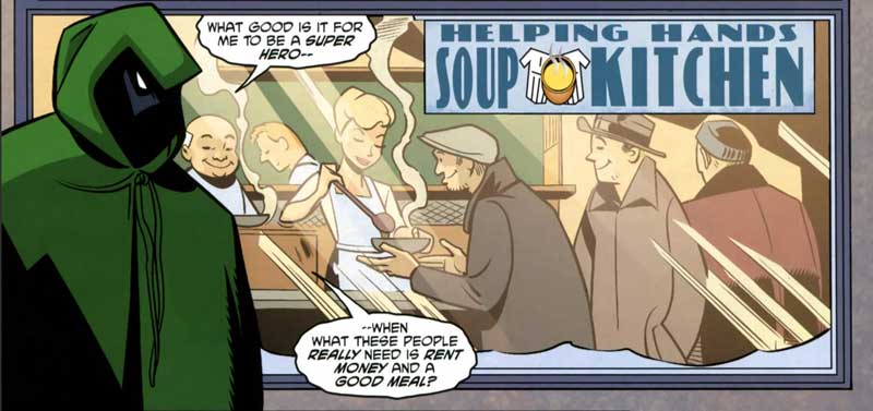 Aber dann kommt auch noch Batman zum Tatort und lobt den Helden. Dieser aber erklärt ihm, dass das nicht viel mit Gerechtigkeit zu tun habe. Batman komme nicht oft in die Nachbarschaft, weil er eher in Uptown Bankräuber und Superschurken fasst, während hier die Armen den Müll durchwühlen müssen. „How is that ‚justice‘?“ Und: „What good is it for me to be a superhero, when what these people really need is rent and a good meal?“ Ein Immobilienunternehmen kauft Grundstücke auf, um Luxuswohnungen zu bauen und die Einwohner zu verdrängen.
