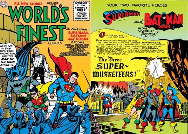 Da treffen sie auch schon auf die drei Musketiere, die d’Artagnan auf der Straße bedrohen. Dick und Bruce schlüpfen in ihre Batman- und Robin-Kostüme und machen den Degenschwingern klar, dass drei gegen einen ziemlich unfair ist. D’Artagnan weist die Hilfe zurück, er kann sich selbst verteidigen. Batman und Robin wissen natürlich, dass die vier Musketiere Freunde werden, weil sie Alexandre Dumas‘ Roman von 1844 gelesen haben und die Literatur für bare Münze nehmen. Deshalb können sie auch weissagen, dass als nächstes Richelieus Wachleute angreifen. Weshalb sie sich trotzdem einmischen, bleibt unklar – vielleicht aus Spaß an der Freude.