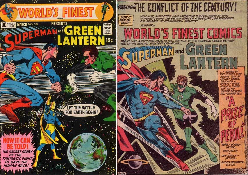 Leute, hier kommt er: „The conflict of the century!“ Die vielen Kriege des 20. Jahrhunderts, allen voran die beiden Weltkriege, waren anscheiend nichts gegen das, was hier geboten wird. Doch bis dahin war die Sache geheim: Sicherheitsbehörden haben sich gefragt, was damals im August 1970 geschehen ist, nun hat DC die Erlaubnis bekommen, diese damals zurückgehaltene Story ein Jahr später zu erzählen: Superman gegen Green Lantern!