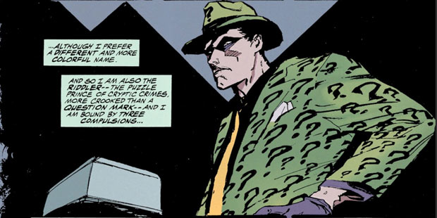 „I’ve always been the Riddler. I always will be …“ Schon als Kind sei er besessen von Rätseln gewesen. Dann erzählt er mehrere Versionen: von seiner Mogelei in der Schule, einer Karriere im Zirkus, nur um sie als mögliche Mythen zu entzaubern. Vielleicht sei er bloß ein frustrierter zweitrangiger Ganove mit einer bedeutungslosen Masche und seine Besessenheit halte ihn davon ab, seine wahre Größe als Verbrecher zu erreichen.