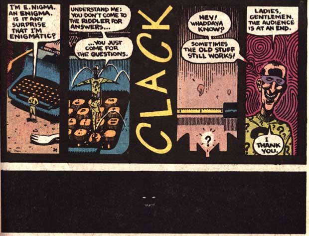 Er sei, wer er sei, sagt er über sich, und maßt sich damit indirekt Göttlichkeit an. „I’m the Riddler. Isn’t that enough?“ Der Riddler war nie rätselhafter als hier. Aber Neil Gaiman hat ihn damit wohl am besten verstanden und zu Ende gedacht. Am Ende sehen wir ihn, nach einem surrealen Rundgang durch die Riesenrequisiten in einem langen schwarzen Balken von Panel verschwinden – reduziert auf zwei weiße Augenschlitze und ein breites Grinsen, wie die Grinsekatze bei Alice im Wunderland. Perfekt.