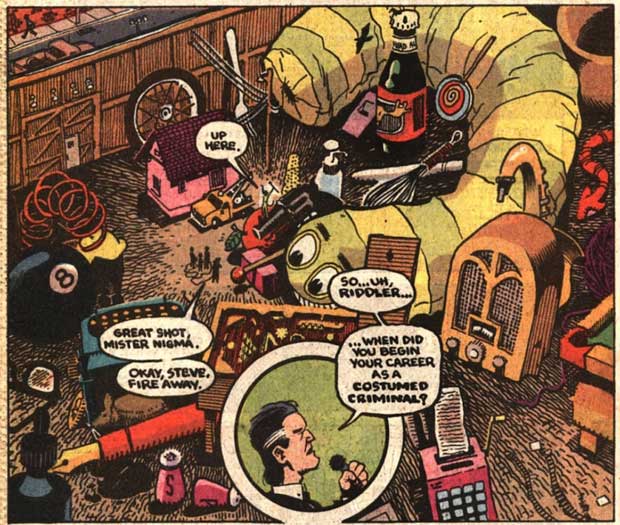 Ein Kamerateam interviewt Edward Nigma in seiner neuen Arbeitsstelle: im Finger Yard, einem Hof, in dem alte Werberequisiten im Großformat eingelagert sind, wie etwa die berühmte Riesenschreibmaschine und so weiter. Doch das Interview verläuft anders als erhofft: Der Riddler beantwortet jede Frage mit Gegenfragen, Multiple-Choice-Antworten und Rätselwitzen.