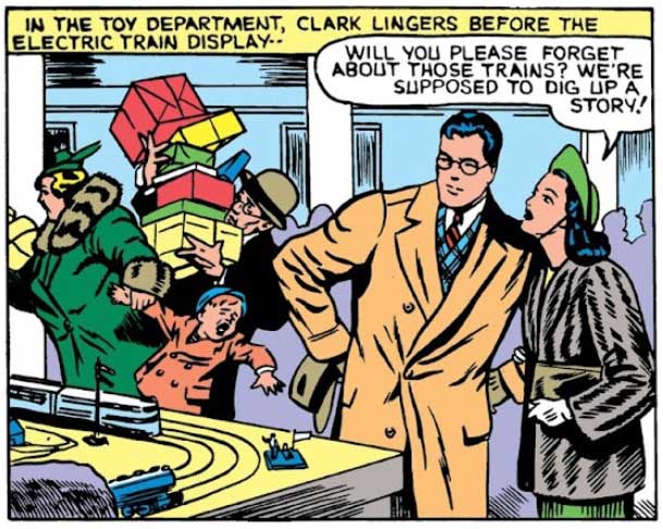 Eine herrlich überdrehte und auch herzerwärmende Geschichte! Optimistisch bis zur Naivität, aber so soll es sein. Besonders ist hier der feine Strich von Jack Burnley zu loben, der es sogar schafft, in kleinen Details glaubwürdige Panels zu schaffen, wie etwa dieses auf Seite 2, das eine Szene im Kaufhaus zeigt: Der Vater trägt einen kippenden Stapel Pakete, die Mutter zerrt am Sohn, der wiederum schreit und zieht in die andere Richtung, während Clark völlig blind für dieses kleine Familiendrama sich eine Modelleisenbahn anschaut, als wäre er selbst noch ein Kind. Eine ganze Szene wie aus dem echten Leben, in nur einem Panel – absolut genial!