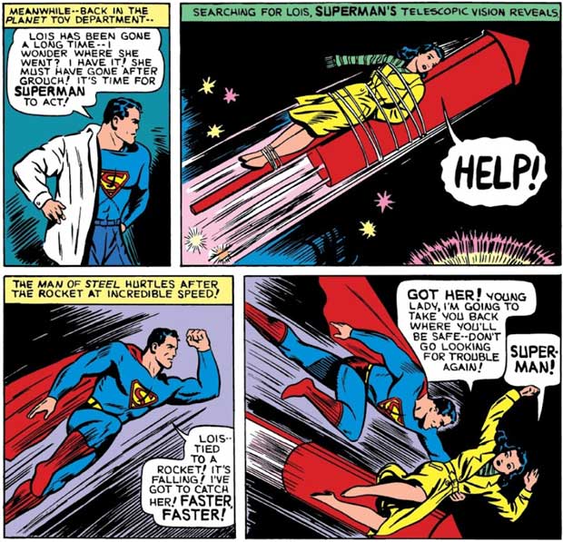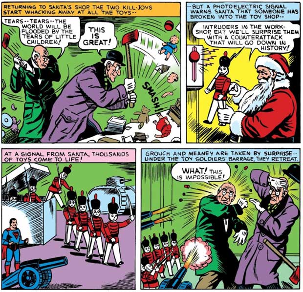 Anscheinend haben die beiden Schurken eine Kamera dagelassen, denn sie sehen später auf einem Überwachungsmonitor, wie die Spielzeugaktion ungestört weitergeht. Also entführen sie die neugierige Lois, binden sie an eine riesige Feuerwerksrakete und jagen sie in die Luft – also fast, denn Superman rettet sie wie immer in letzter Sekunde. Derweil fliegen die freudlosen Mieslinge wieder zum Nordpol und randalieren in der Spielzeugwerkstatt. Dann lässt der Weihnachtsmann die mechanischen Spielzeugsoldaten auf sie los und sie fliehen.