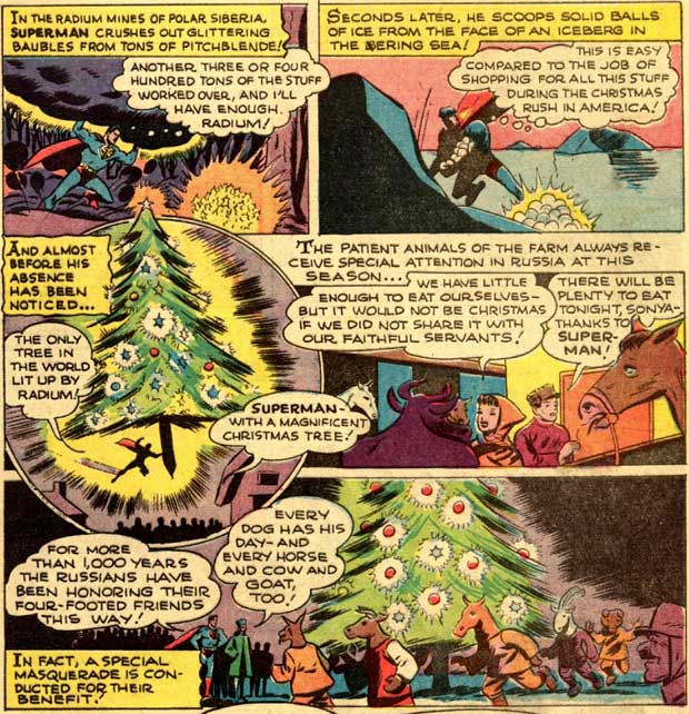 Zuerst hilft er dabei, Geschenke zu „Eskimos“ am Nordpol zu bringen, dann vereint er Tochter und Mutter in China sowie einen Sohn mit seinen Eltern in Russland. Da es in dem kriegszerstörten Land angeblich an Bäumen fehlt, pflückt Superman schnell eine Tanne im Norden und schmückt ihn mit Radiumkugeln, weil radioaktives Material bekanntlich „strahlt“ … (Bitte nicht zu Hause nachmachen! Das geht sicher nicht gut aus für die armen Leute …)
