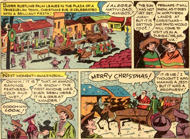 In Holland verkleidet sich Superman als Sint Nicolaas, kommt traditionsgemäß auf einem weißen Pferd herbeigeflogen und steigt durch den Kamin, um die Eltern mit ihrem Sohn zu überraschen. Traditionell stellt man Holzschuhe davor, damit sie gefüllt werden. Es folgen kurze Stopps in Frankreich und England, bevor Superman in Norwegen einen riesigen Schneeball bildet und es damit in Venezuela schneien lässt, bevor er als Weihnachtsmann mit Rentieren und Schlitten vorbeikommt. Der Schnee schmilzt in dem tropischen Land natürlich sofort und auch das Santa-Claus-Kostüm ist bei der Hitze nicht die beste Idee. Aber der gute Wille zählt – obwohl keiner danach gefragt hat. Immerhin hat es der Ami unter dem Sombreroträgern mal mit dem Kulturimperialismus versucht … (Trägt man dort die Hüte überhaupt?)