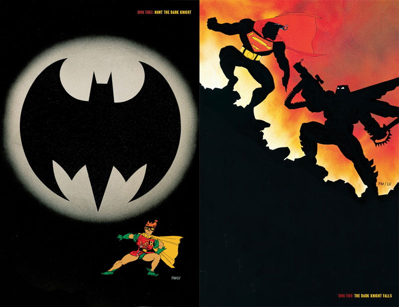 Die ikonischen Cover sind Meisterwerke des Minimalismus. Kein Joker, kein Two-Face, überhaupt kaum etwas über den Inhalt. Mal nur eine Silhouette, dann nur ein riesiges Batman-Logo mit einem kleinen Robin (Carrie Kelley) am Rand. Nur beim vierten Teil wird der Kampf mit Superman angedeutet. Aber auch da: Das Meiste bleibt tiefschwarz. Miller beherrscht Schatten perfekt. Oft erscheinen Figuren auch komplett schwarz, nur mit hervortretenden Merkmalen wie einem Logo auf der Brust. Die Motive sind aufs Wesentliche reduziert und wecken Neugier.