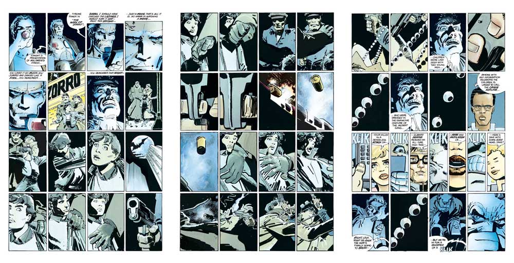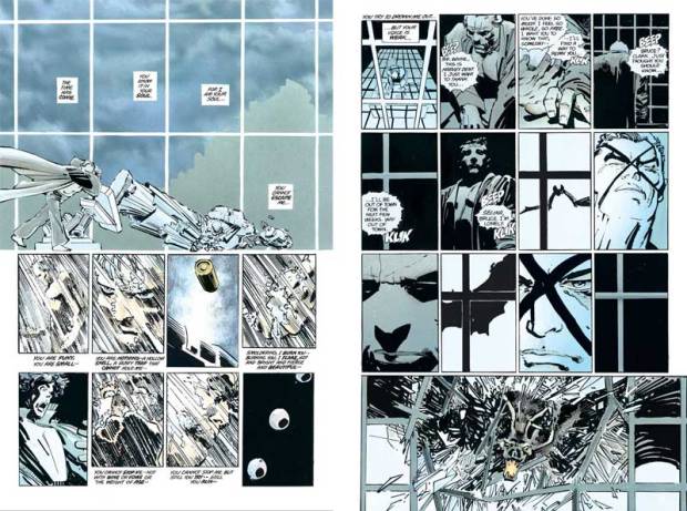 Die Sequenz umfasst drei ganze Seiten, bis sich auf der vierten Seite die Rasterstruktur auflöst und doch fortsetzt in der Fensterfront von Wayne Manor. Bruce flieht, stößt eine Statue um, die zerbricht. Auf der fünften Seite fällt das Raster als Schatten in den Raum und auf Bruces Gesicht, wo er eine Maske andeutet, während sich eine Fledermaus dem Fenster nähert und es schließlich durchbricht. Höchst unrealistisch, aber ungeheuer effektiv: Hier wird auch ein seelischer Durchbruch visualisiert.