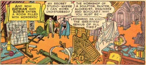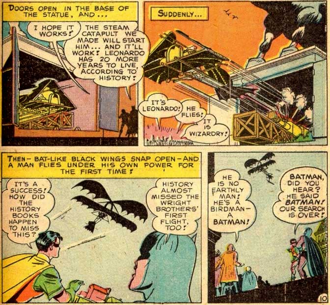 Batman hat mehrere Väter und noch mehr Inspirationsquellen. Eine davon soll Leonardo da Vinci gewesen sein. Seine an Fledermausflügeln orientierte Entwürfe für Fluggeräte sollen Bob Kane zu Batman inspiriert haben – deshalb hatte dieser anfangs noch ein steifes Cape, mit dem er durch die Luft gleiten konnte. Daher war es nur konsequent, dass Batman einige Jahre später bei einer seiner Zeitreisen auf den Künstler und Erfinder traf.