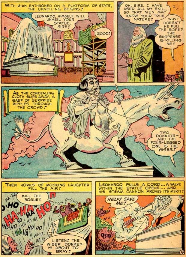 Der Mann stellt sich als Leonardo heraus. Er führt sie in seine Werkstatt. Er soll ein großes Reiterstandbild für den Herrscher Gian Trivulao erschaffen, wozu er aber keine Lust hat, weil der Herrscher ein Verräter ist und gemeinsame Sache mit den Franzosen macht. Gian will ihn töten, weil Leonardo sich geweigert hat. Batman sieht das Fluggerät und macht einige Verbesserungsvorschläge.