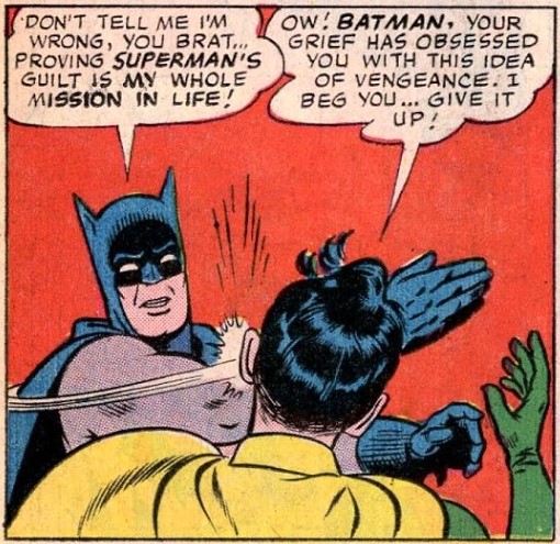Obwohl es keine Beweise gibt, hält Batman seinen Verdacht für eine Tatsache. Als Robin daran einmal berechtigte Zweifel äußert, kriegt er nicht nur eine Abreibung von Batman, sondern danach auch das Gedächtnis gelöscht. Wer nicht für ihn ist, ist gegen ihn.