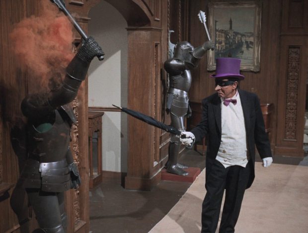 Batman hat natürlich einen Lageplan im Bat-Computer, auf dem er sieht, wie man da am besten einbricht. Gesagt, getan. Was nun, die Polizei verständigen?, fragt Robin. Nein, er habe mit dem Pinguin noch eine Rechnung offen, sagt Batman und kümmert sich selbst darum. Doch trotz der Batzooka glückt die Entführung dank Magneten, mit denen Batman und Robin festgehalten werden. Wieder könnte man beim Pinguin vorbeischauen und ihn einfach verhaften. Aber dann gäbe es kein Finale in Wayne Manor, wo Batman und Robin in Ritterrüstungen warten …