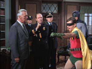 Einmal pro Folge müssen Batman und Robin den Bat-Computer benutzen oder sonst irgendein (explizit beschriftetes) Bat-Gimmick, von dem vorher nie die Rede war. Bathöhle, Batgürtel und Batmobil sind wahre Schweizer Taschenmesser. Einmal pro Folge gehen Batman und Robin eine Wand hoch. Und genauso zuverlässig tappen sie in eine Todesfalle, aus der sie sich in letzter Sekunde irgendwie befreien können – wobei das Wie so nebensächlich ist wie das Warum für die meist aufwendige Falle. Zugegeben: Batman und Robin haben eigentlich mehr Glück als Verstand und sind damit eigentlich nicht besser als die Polizei von Gotham, aber sie triumphieren, weil sie es immerhin versuchen.