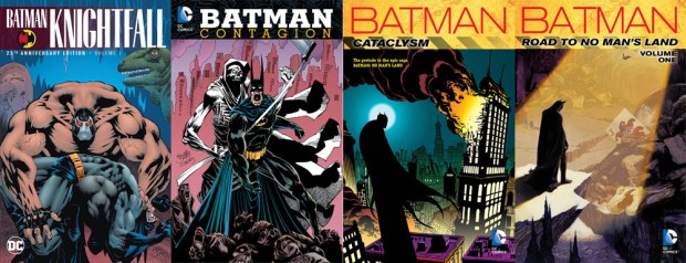 Knightfall, Contagion, Cataclysm und No Man’s Land sind in mehreren Paperbacks erschienen. Kürzere Storys sind u.a. in den Sammlungen The Caped Crusader, The Dark Knight Detective sowie Batman by Doug Moench & Kelley Jones Vol. 1-2 (2014-2018) zu finden. Weitere Paperbacks sind hier aufgelistet.