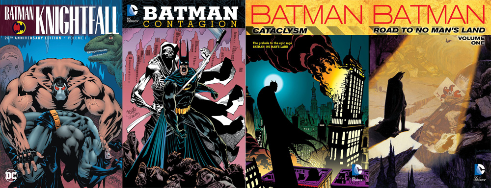 Knightfall, Contagion, Cataclysm und No Man’s Land sind in mehreren Paperbacks erschienen. Kürzere Storys sind u.a. in den Sammlungen The Caped Crusader, The Dark Knight Detective sowie Batman by Doug Moench & Kelley Jones Vol. 1-2 (2014-2018) zu finden. Weitere Paperbacks sind hier aufgelistet.