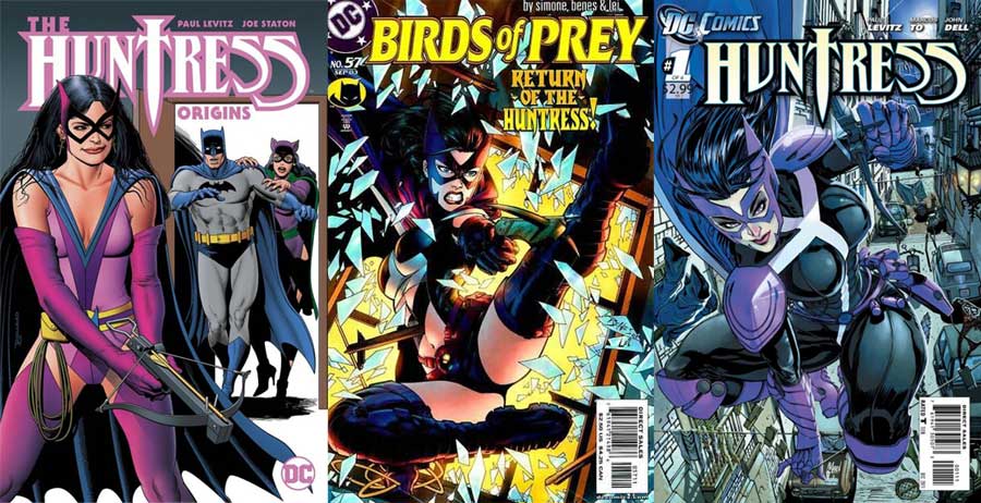 Die Heldin Huntress hatte ihren ersten Auftritt 1977 als Helena Wayne. In der Serie Wonder Woman bekam sie Anfang der 80er Back-up-Storys. (Einige davon sind gesammelt im Paperback The Huntress: Origins, 2020.) Die zweite Version als Helena Bertinelli erschien erstmals 1989 in ihrer eigenen Serie. 2003 schloss sie sich den Birds of Prey an (zu denen auch Black Canary und Oracle gehörten).