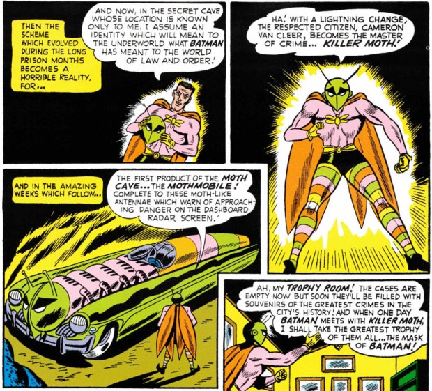 Wie dem auch sei: Als Cameron Van Cleer gewinnt das Vertrauen der High Society, wird sogar in den Vorstand des Gotham Museum berufen, er kauft sich (von seiner alten Beute) ein Anwesen, dann lässt sich darunter eine Höhle graben und bringt die Arbeiter anschließend um. Die Höhle braucht er für sein Geheimversteck, denn er weiß, dass Batman auch so eins hat. Und so zieht sich Cameron ebenfalls wie ein Tier der Nacht an, eine Motte (nur viel bunter), baut sich ein Mothmobile (das aussieht wie eine Raupe) und richtet sich auch ein Labor und (sehr zuversichtlich) einen Trophäenraum ein.
