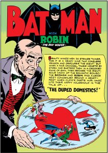 Es beginnt mit einem Raub bei Nebel. Der Joker stiehlt einer Frau die Juwelen vom Hals. Doch die Steine waren falsch. Zufällig sind Bruce und Dick dabei, schlüpfen im Schutz des Nebels in ihre Kostüme, aber der Joker entwischt ihnen. Dann stiehlt der Joker einen Haufen wertloser Münzen, und schließlich eine Nachbildung der Mona Lisa. Was soll das?