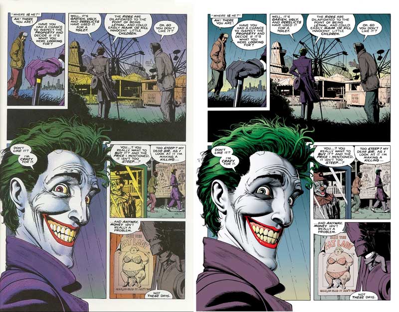 Von The Killing Joke sind neben der Deluxe Edition (mit neuer Kolorierung von Brian Bolland) auch eine Noir-Edition (in Schwarzweiß) sowie eine Absolute Edition erschienen, die beide Kolorierungen (die erste von John Higgins) und das Typoskript von Alan Moore enthält.