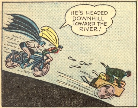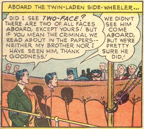 Es wird noch absurder: Two-Face haut in einer zweirädrigen Karre ab, mit der er bergab rollt, das Dynamische Duo verfolgt ihn auf eine Tandem, Two-Face versteckt sich auf einem Dampfer, auf dem ein Zwillingstreffen stattfindet, tarnt sich mit einer Maske und tut so, als hätte er einen Zwillingsbruder, indem er einen kopfförmigen Luftballon schweben lässt. Batman lässt sich davon so leicht für dumm verkaufen, dass es ihm selbst peinlich ist.