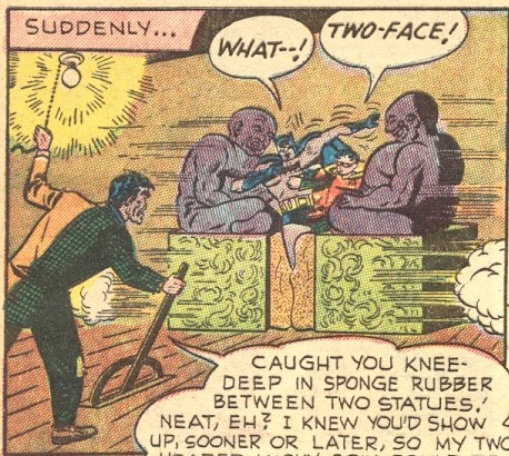Kann man das noch steigern? Man kann: Bei der Verfolgung werden Batman und Robin im Theater von Two-Face zwischen zwei große Schaumkissen geklemmt. Bevor er sie tötet, wirft er fairerweise eine Münze, es geht wieder gut für die beiden aus. Statt sie sich selbst zu überlassen überreicht Two-Face ihnen ein Schwert, mit dem sie sich befreien können. Bei der Flucht stürzt er jedoch unglücklich und wird bewusstlos. Und haut dann doch wieder ab, weil alles nur gespielt war.