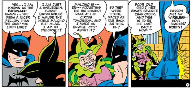 Batman und Robin kennen bereits Brane Taylor, den blonden Batman aus dem Jahr 3054 (bzw. 3051 in Batman #67, 1951). Wie gut, dass Brane ein „super-scientific radio“ dagelassen hat, mit dem man ihn rufen kann. Kurz darauf erscheint eine gelbe Kugel, Brane kommt raus und übernimmt den Part seines Vorbilds.