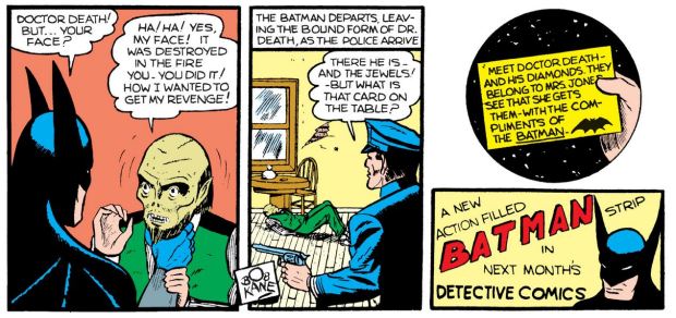 Die dritte und vierte Batman-Story fallen durch drei Neuerungen auf: Sie stammen von einem neuen Autor, Gardner Fox, sie bilden einen Zweiteiler und sie führen den ersten Superschurken ein, einen Mad Scientist namens Doctor Death.