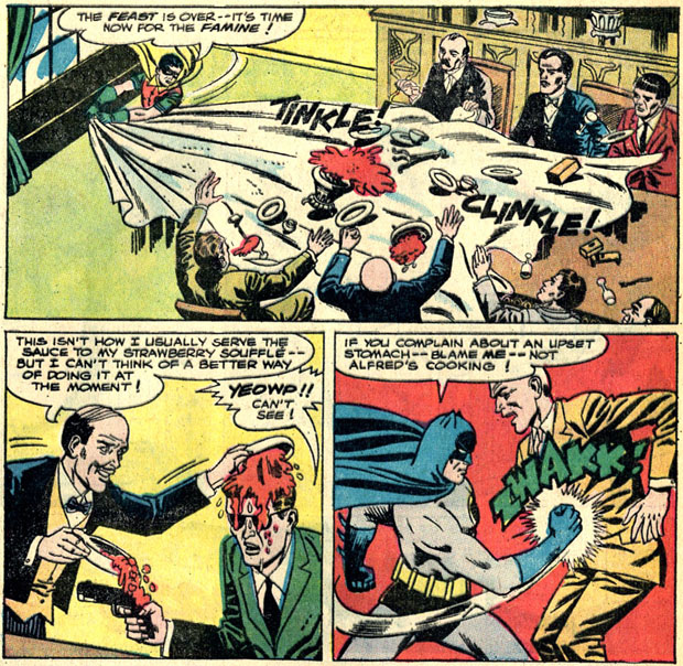Bruce und Dick gehen Alfreds Rezepte durch und leisten knallharte Detektivarbeit, die nahe an Gedankenlesekunst grenzt. Sie finden Alfred und mischen die Missetäter ordentlich auf. Jetzt wäre es natürlich sehr cool, wenn Batman sagen würde: „Gentlemen, you have eaten well …“ (Preisfrage: Woher stammt das Zitat?) Doch Robin hat einen noch viel besseren Spruch auf Lager: „The feast is over–it’s time now for the famine!“ Die Diät wird mit Fäusten in die Magengrube verordet …