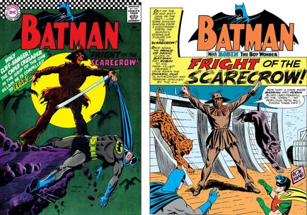 Nach zwei Auftritten in den 40ern verschwand Scarecrow für 24 Jahre, erst 1967 kehrte er wieder in die Comics zurück. Daher musste man den jungen Lesern von damals noch einmal die Origin-Story aus World’s Finest #3 (1941) erzählen, damit sie überhaupt wussten, was Sache ist: Jonathan Crane, als Kind gerne Vögel aufgescheucht, später Psychologie-Professor mit dem Forschungsschwerpunkt Angst und schließlich professionelle Vogelscheuche. Angstgas hatte er damals noch nicht – diese Pioniertat war zunächst nur Hugo Strange vorbehalten.