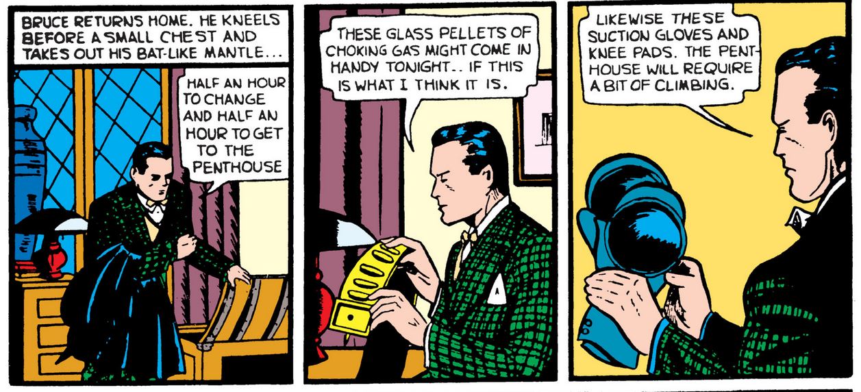Erstmals sehen wir Batman bei der Vorbereitung: Er nimmt Handschuhe und Knieschoner mit Saugnäpfen mit, um die Wand hochgehen zu können, außerdem steckt er Tränengas in seinen Gürtel, der zum ersten Mal eine Funktion bekommt. Die Leser bekommen alles gezeigt: Wie Batman in seinem roten Auto hinfährt, wie er es an einem abgelegenen Ort parkt, wie er sich mit einem Lasso am Haus hochzieht und dann weiter hinaufkrabbelt – wie eine Riesenfledermaus, heißt es, aber es wirkt eher wie eine Spinne.