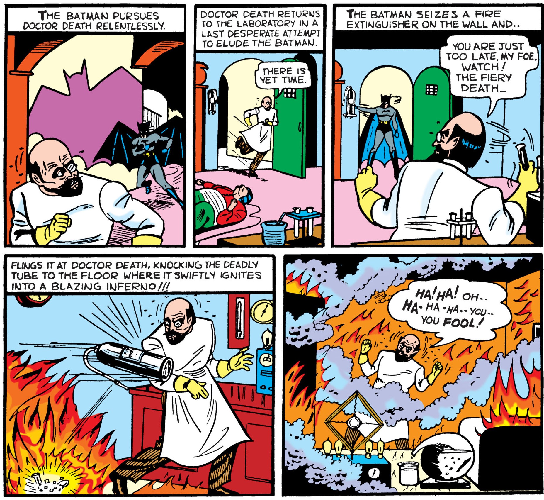 Die dritte und vierte Batman-Story fallen durch drei Neuerungen auf: Sie stammen von einem neuen Autor, Gardner Fox, sie bilden einen Zweiteiler und sie führen den ersten Superschurken ein, einen Mad Scientist namens Doctor Death.