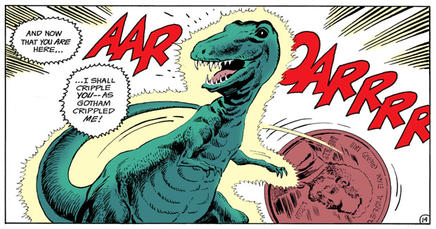 Doch Batman hat ein paar Chemikalien im Stiefel versteckt, mit denen er sich freisprengen kann. Mit einem Schlag fällt Strange in einen Abgrund, die Monster bringen sich gegenseitig um, während Batman ein Gegenmittel zusammenbraut. Und dann wird es blutig. Batman verfolgt im Batplane zwei Ganoven, die ein Monster in die Stadt bringen wollen. Batman ballert auf sie los: „Much as I hate to take human life, I’m afraid this time it’s necessary!“ Man kann zurecht bezweifeln, dass das unbedingt nötig ist. (Reifen zerschießen wäre zum Beispiel ein Weg.) Der spätere Batman findet immer einen Weg, wie man Tote vermeiden kann.
