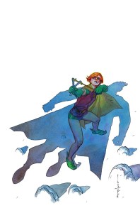 Schließlich wird noch zweimal Robin geboten: Bei Amanda Conner steht Carrie Kelley im Vordergrund, die unbeschwert mit ihrer Zwille in Richtung Betrachter zielt. Batman legt hier bloß väterlich seine schwere Hand auf Robins Schulter, anders als bei Jim Lee ist der Held hier Beschützer statt Beschützter. Insofern ergänzen sich die Bilder sehr gut. Das Beste kommt aber zum Schluss: Auch Brian Stelfreeze hat Robin gewählt, auch mit Zwille, aber sie zielt auf eine Figur, die bloß als Schatten auf sie fällt: Superman. Das kleine Mädchen lehnt sich mit ihrer harmlosen Waffe gegen den Unbesiegbaren auf. Mensch gegen Übermensch. Eine wunderbar subtile Darstellung des Themas. Eine wahre Offenbarung. Danke dafür.